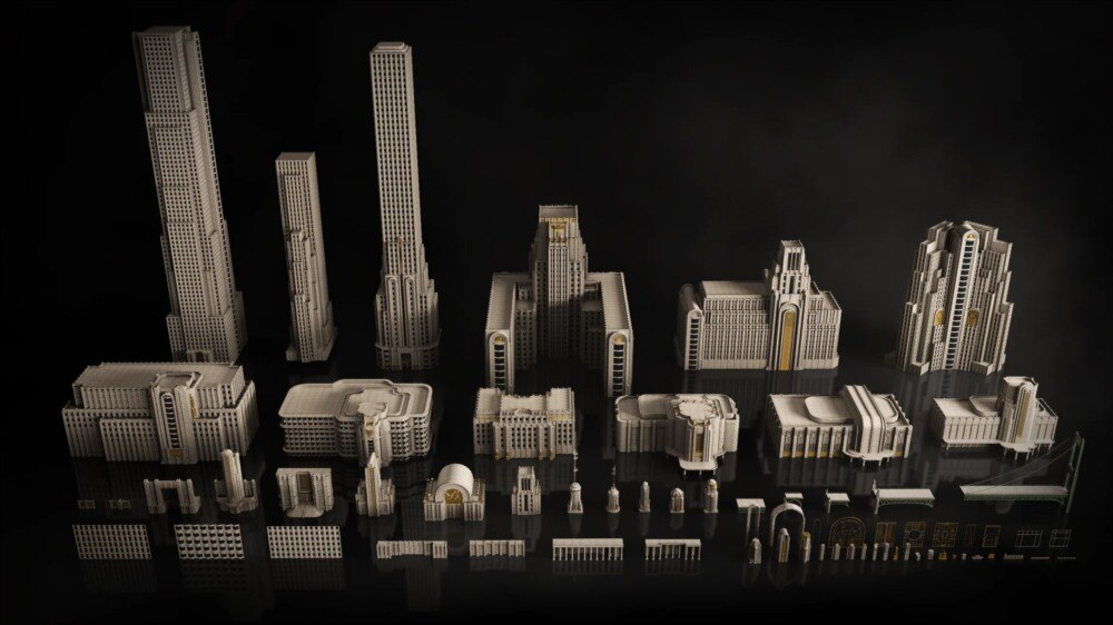 Art Deco 资产包涵盖从城市地标到精细装饰的完整建筑体系,包括以下类别: